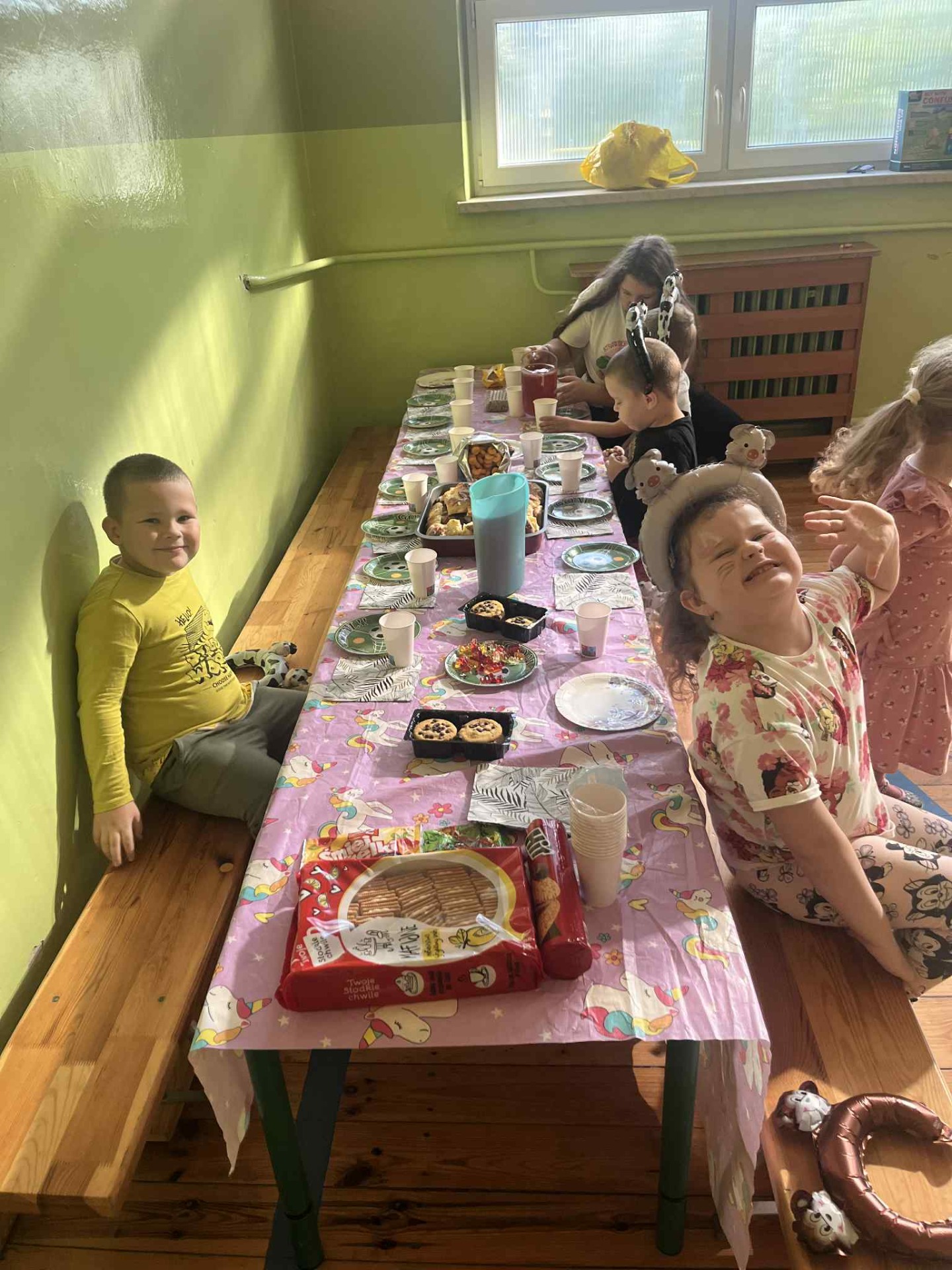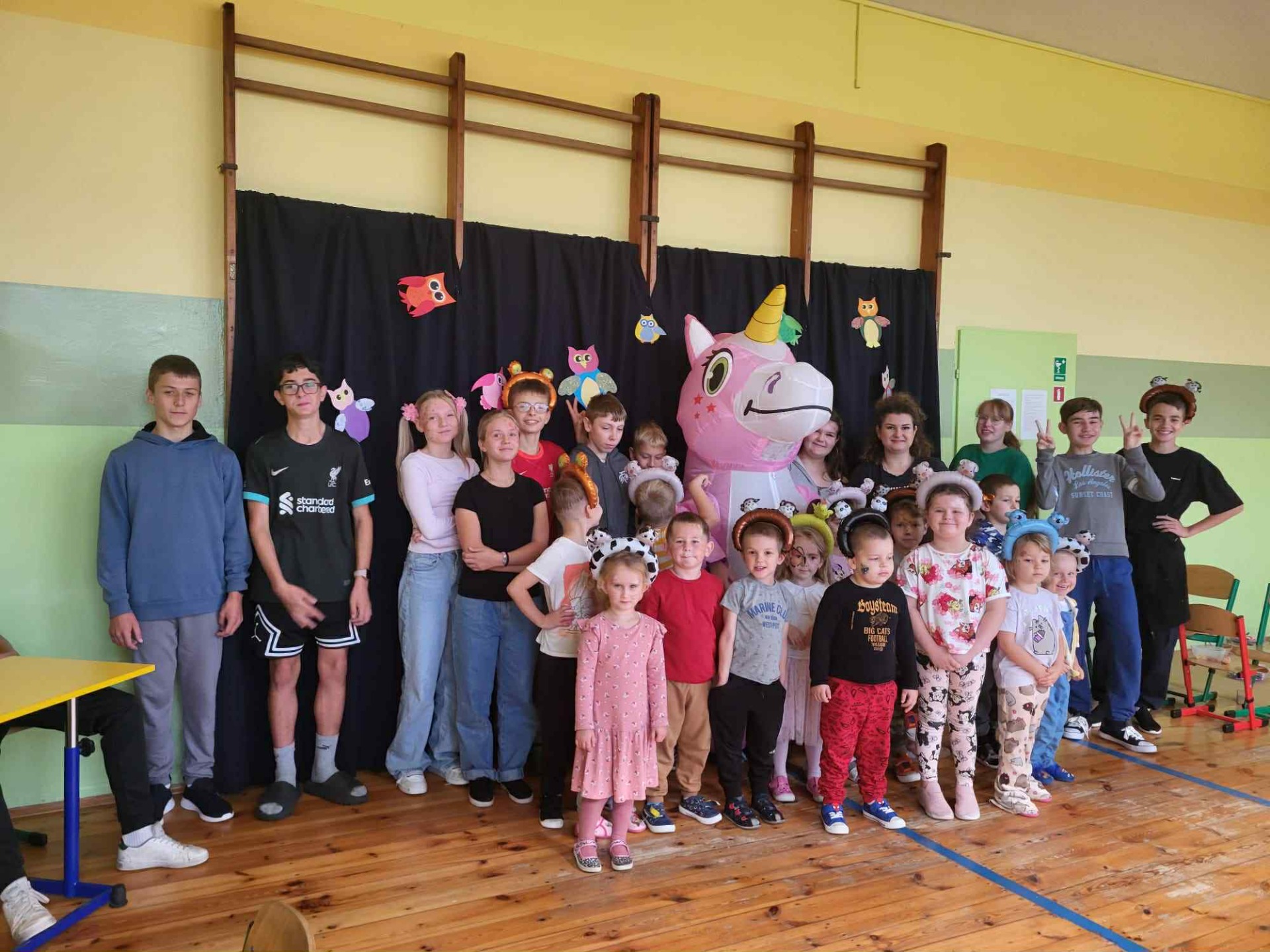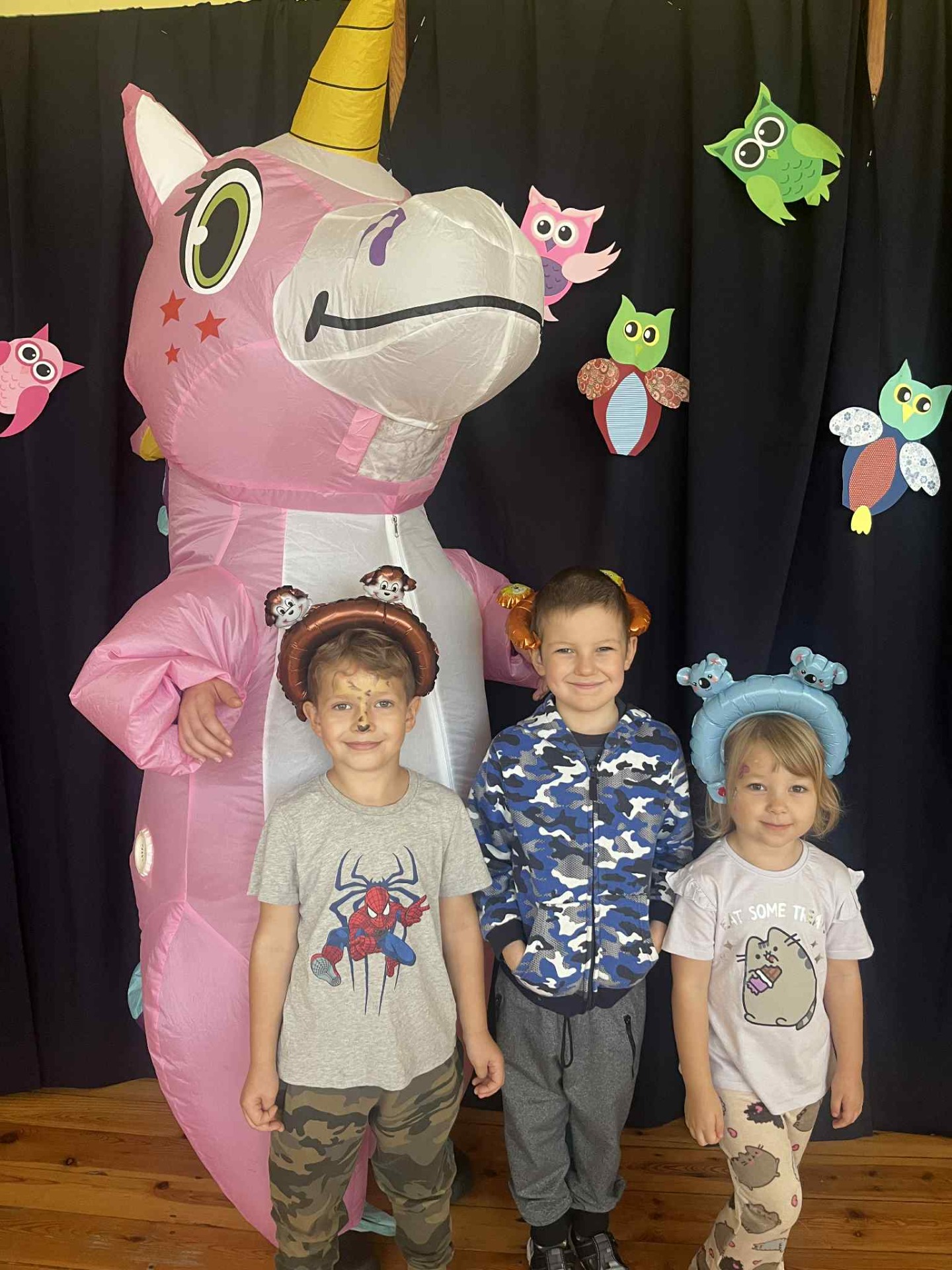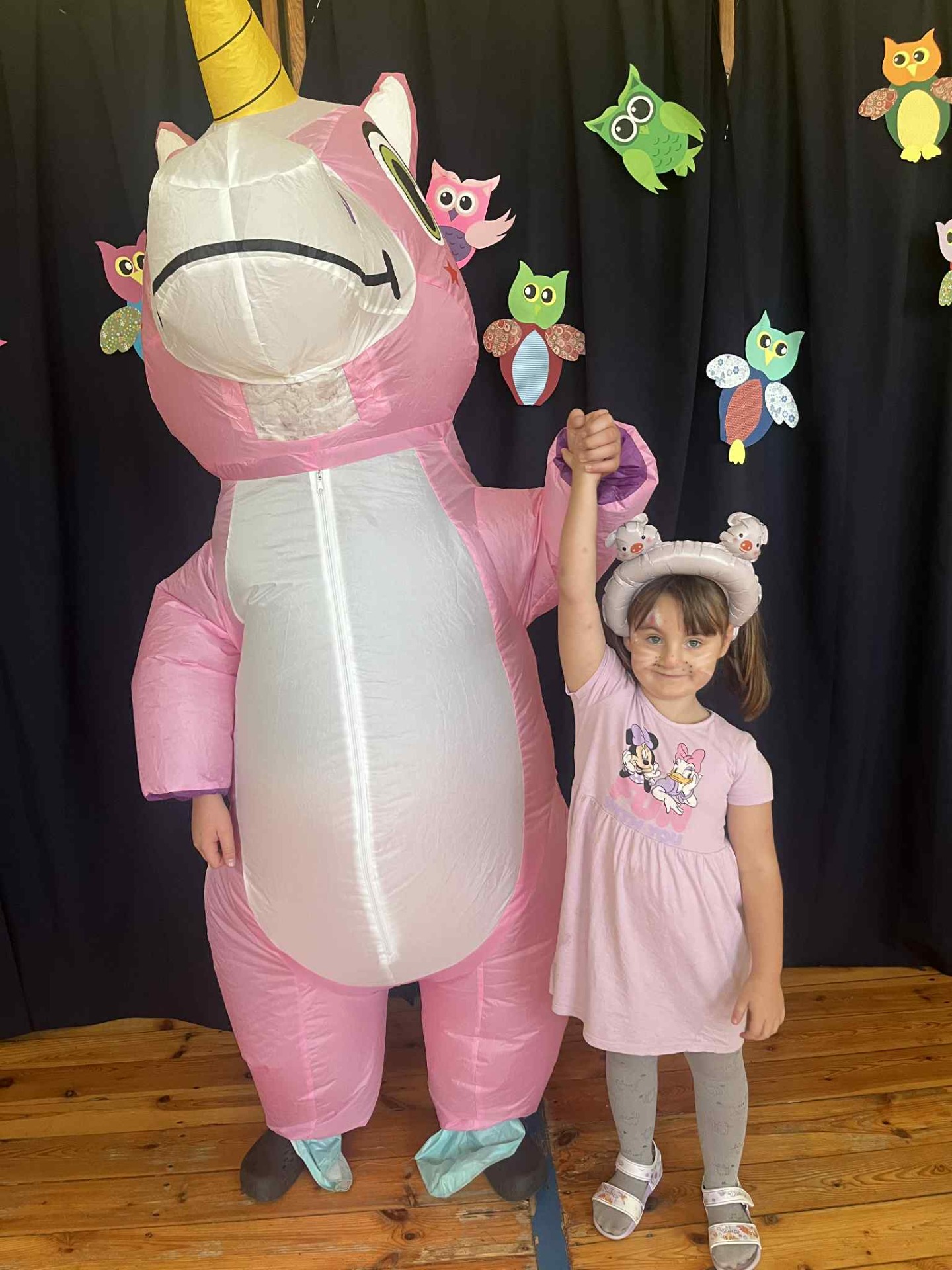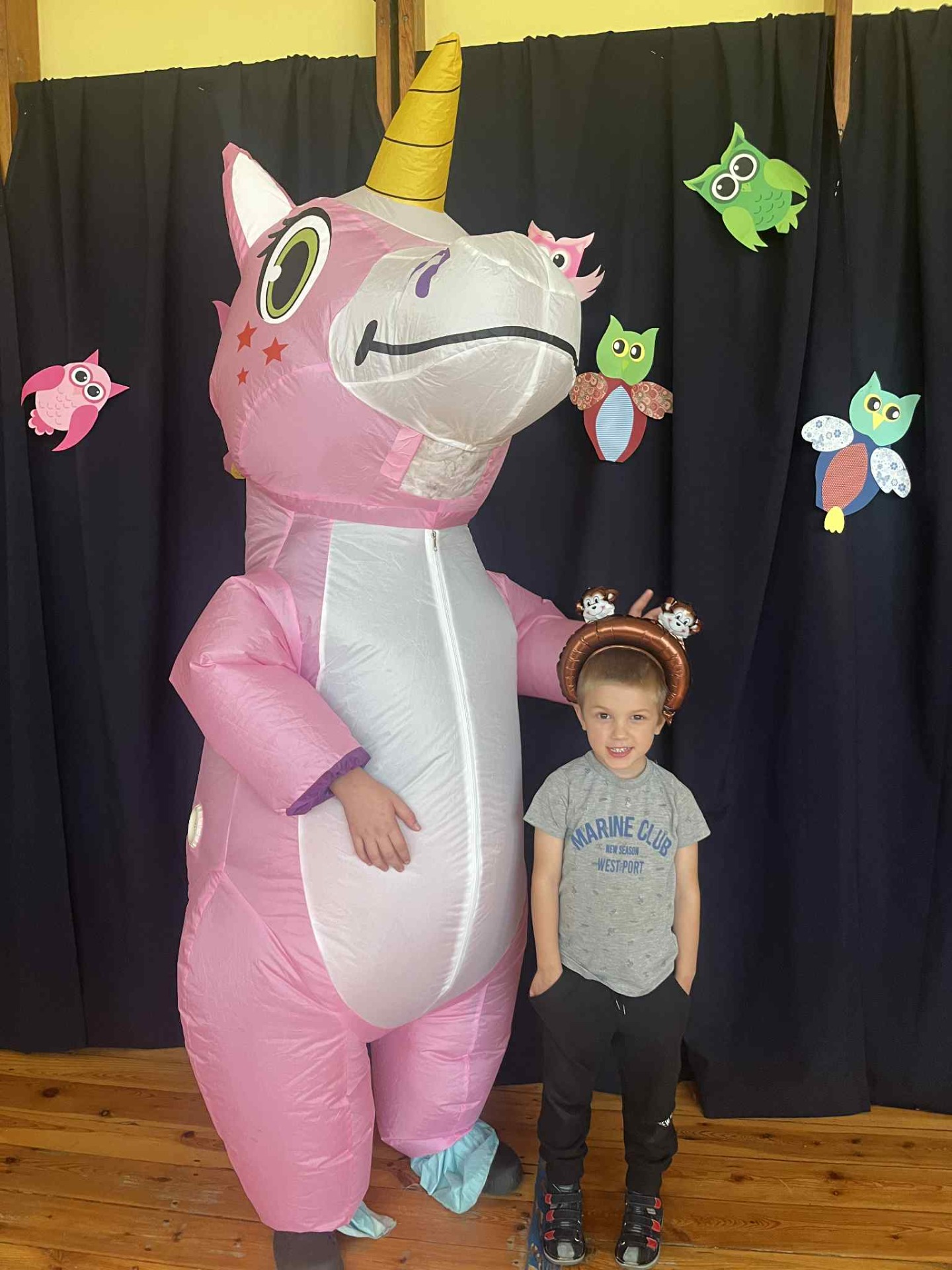 Największą niespodzianką okazała się wizyta maskotki – wesołego jednorożca 🦄, który towarzyszył dzieciom w zabawie.
