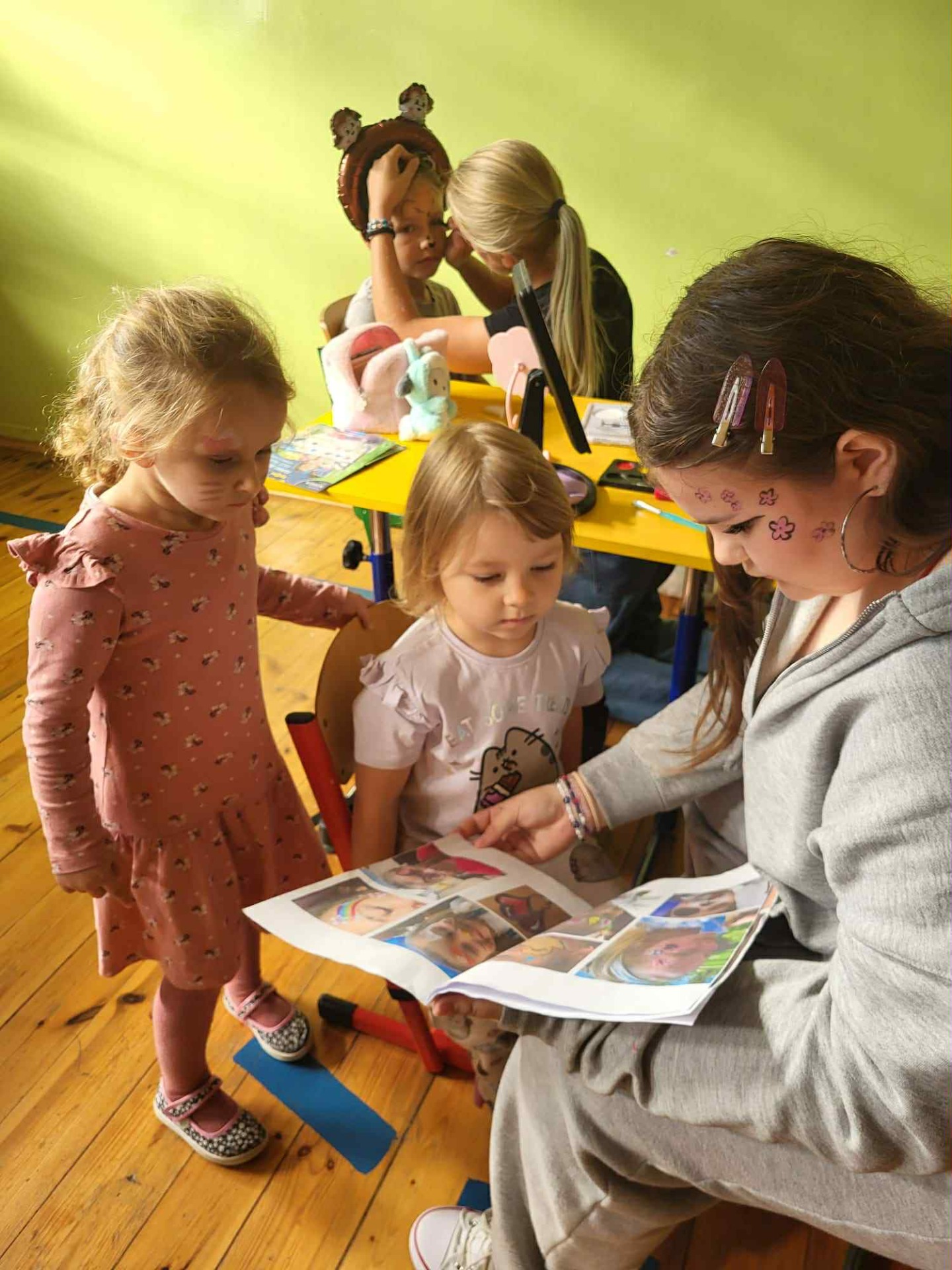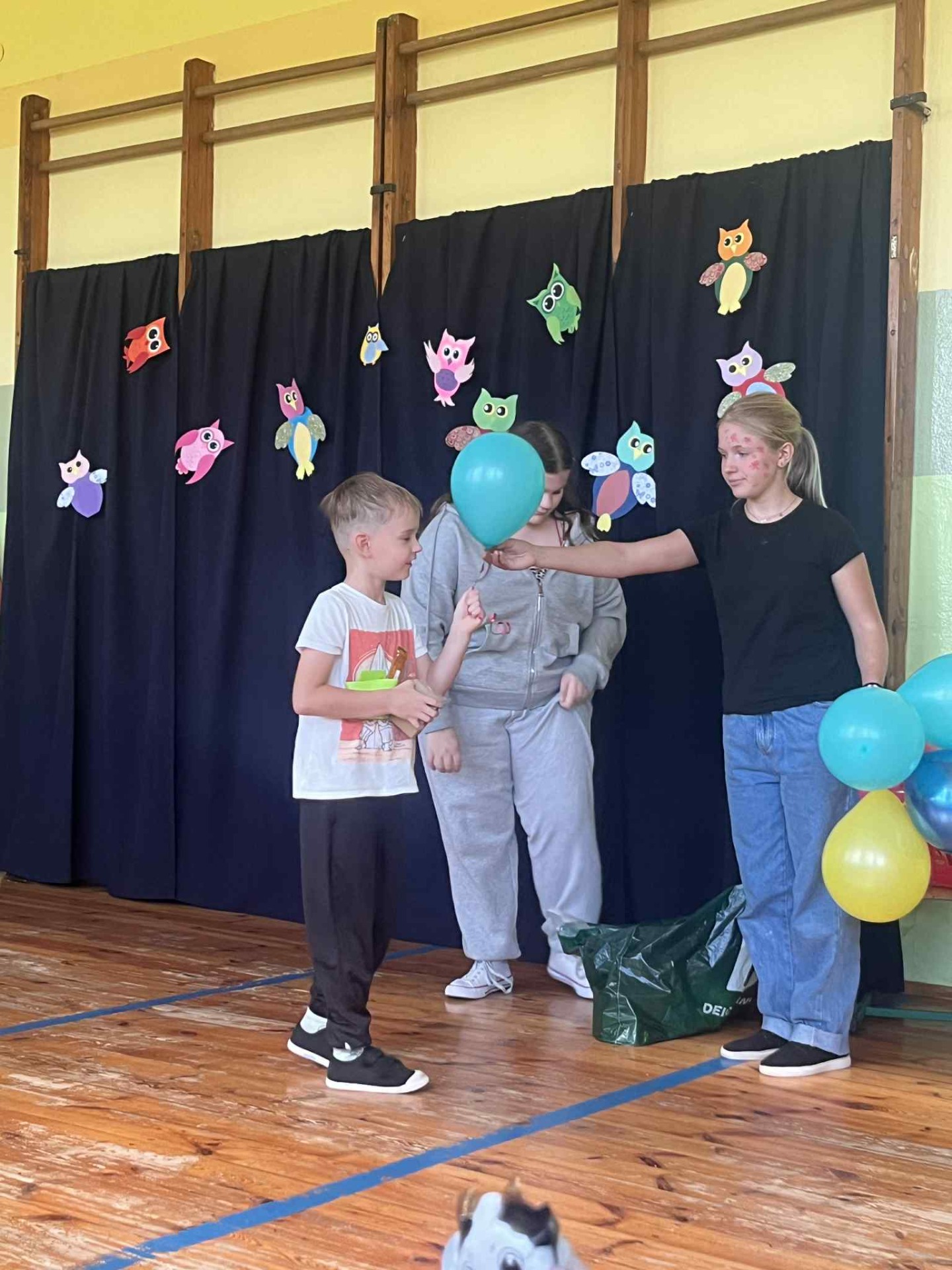 We wtorek przenieśliśmy się na salę gimnastyczną, gdzie starsi uczniowie przygotowali dla najmłodszych wiele atrakcji. Czekał na nas tor przeszkód, malowanie buziek, słodki stół, a także pyszne drożdżówki i rogaliki upieczone przez rodziców. Przedszkolaki świetnie bawiły się podczas zgadywanek – odgadywały, co ukryło się w pudełku oraz rysowały przedmioty schowane w balonikach.